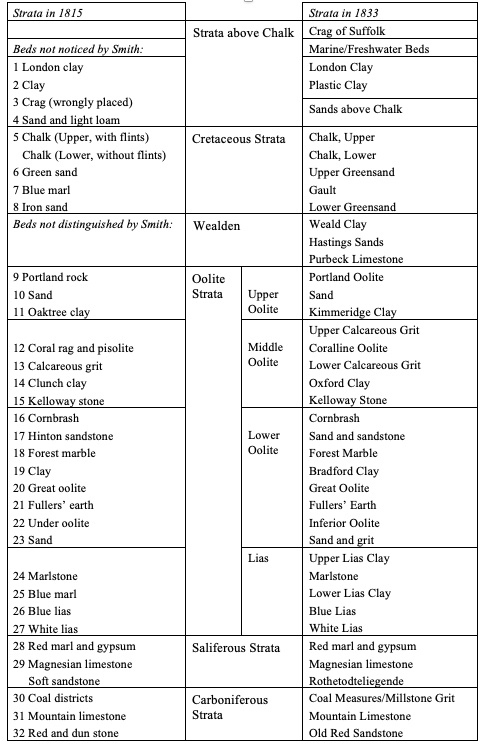 [56]. On Phillips, Morrell (1988a: 11;1989: 329). ‘Table of Strata’, reproduced in Phillips (1844: 30) and Sheppard (1917: 109). For ‘he set me …’, Phillips (1860: xxxviii) which also contains an unpublished ammonite table composed in 1817. On distribution, Smith (1817: viii). This was published in August 1817. It has been inferred that Stratigraphical System was principally the work of Phillips (Cox 1942: 57; Edmonds 1982: 148). While Phillips certainly produced the catalogue, the introductory discourse was Smith’s and it is clear from Phillips’s comments above and elsewhere that his work was closely supervised at this time.