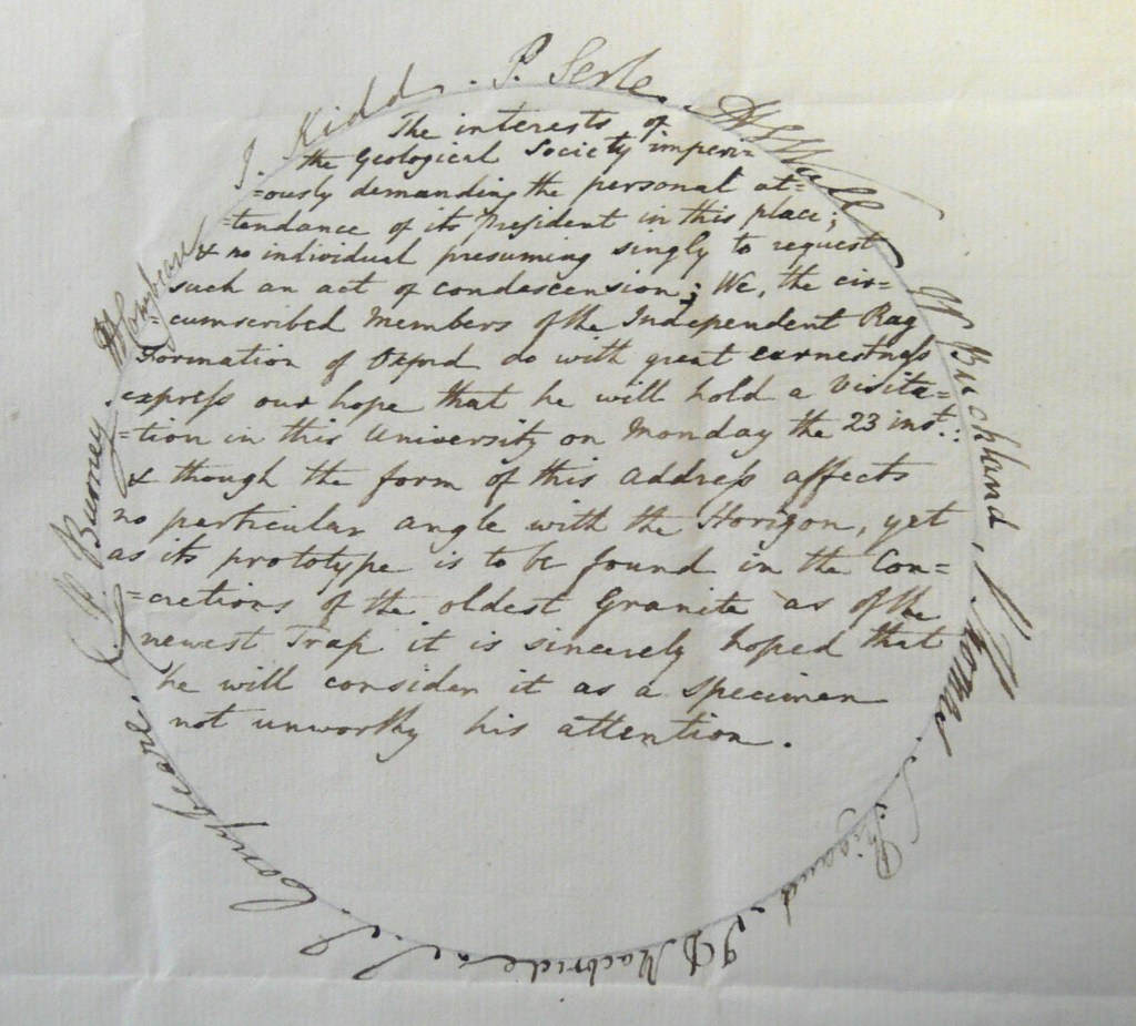 This reprimand was accompanied by a circular invitation recording the names of the ‘Members of the Independent Rag Formation of Oxford’ (Fig. 1). However, Greenough could not attend, which called upon Conybeare to respond playfully, ‘I regret extremely that the Gnome of the mines was of so stubborn a nature as placed him beyond the influence of our magic circle to which every sprite of more gentle frame and occupation must necessarily have been obedient’.[30]