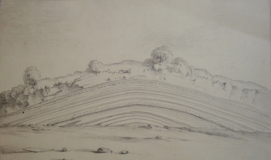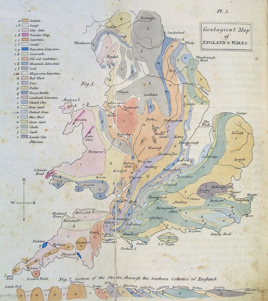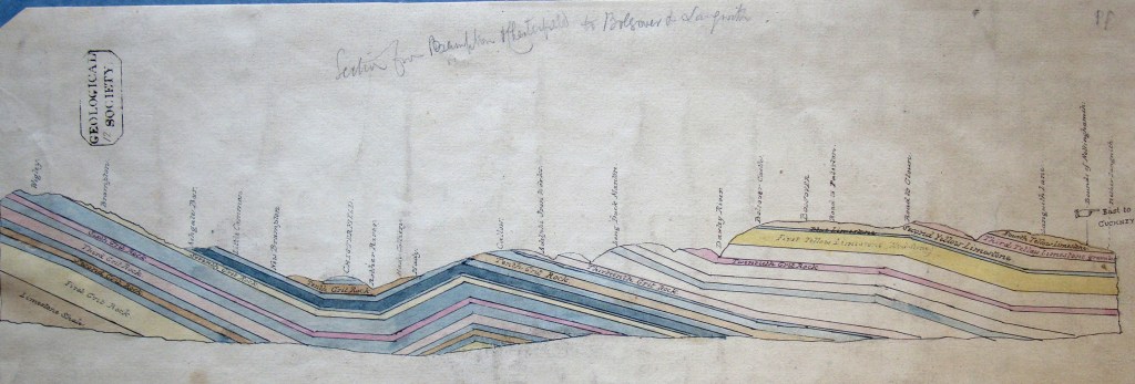 [81] This natural arrangement was not in itself an invention of Smith. Whitehurst (1786, p 204-5), had suggested that a geological museum could be arranged along these lines in order to display the nature and productions of strata as they are found in the field. He makes no particular mention of fossils or their utility, however.