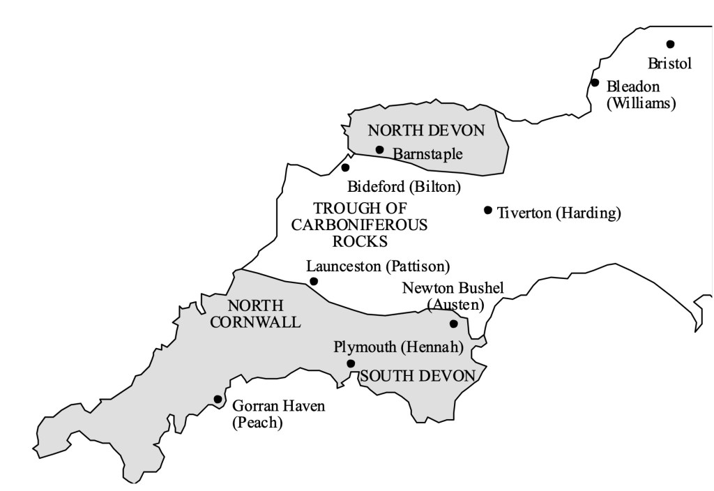 Of the other collectors, Pattison and Holl contributed Petherwin fossils; Harding’s material came from around Barnstaple; and Williams, who lived on the edge of the Mendips and did not have the luxury of patronising local quarrymen, collected from North Devon. Other collectors, such as the impoverished Cornish coastguard Charles William Peach, neither had the wealth to patronise quarrymen and artisan collectors nor leisure for long sojourns in the field, though he had the intellect and application to seek out and interpret his finds.